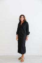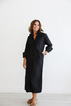 Details like side slits for movement and pockets (yes, pockets!) make it as practical as it is stylish. Wear it belted for a defined shape, layered open as a duster, or simply on its own with boots or sneakers — this is the dress that does it all.