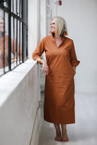 Designed for effortless elegance, this midi shirt dress features a flattering straight silhouette, a polished collar, pockets, and side slits for easy movement. The rich copper hue makes it a standout choice for fall—warm, sophisticated, and endlessly versatile.