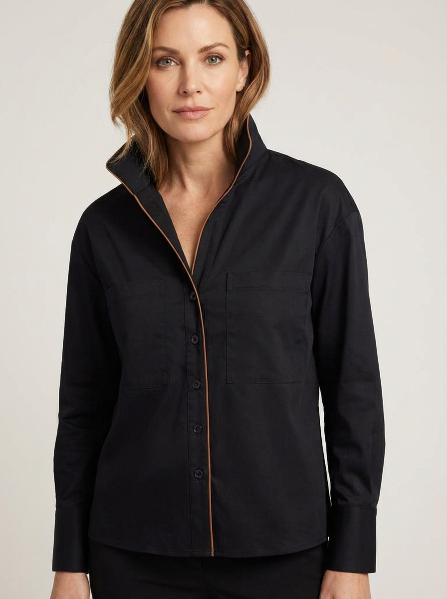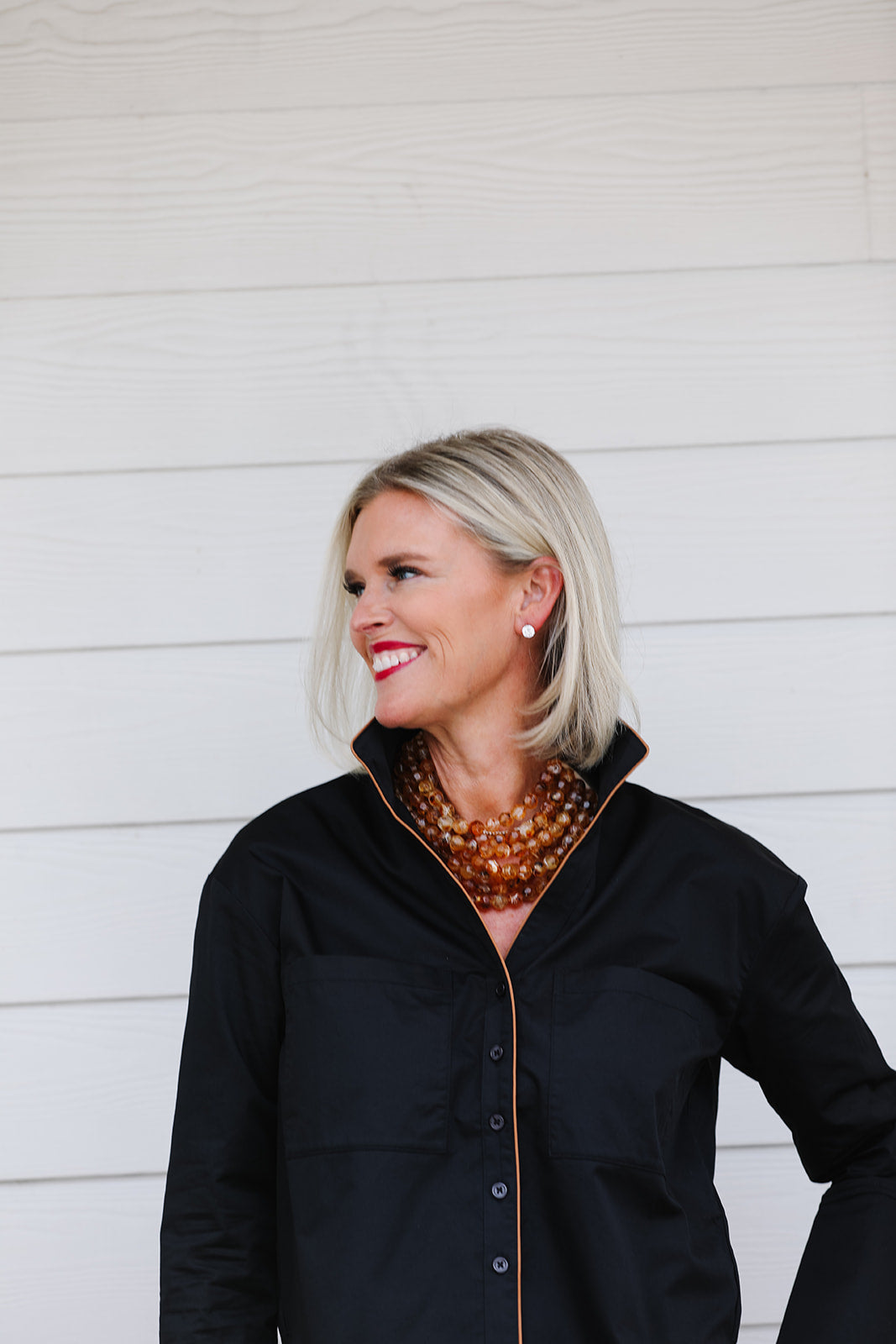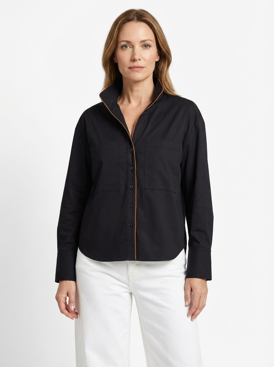 Say hello to The Piper in Black with Tobacco Piping— our fresh, modern take on the everyday button-down. With her relaxed (but not oversized) fit and slightly cropped length, she offers an easy silhouette that’s flattering without the extra volume.