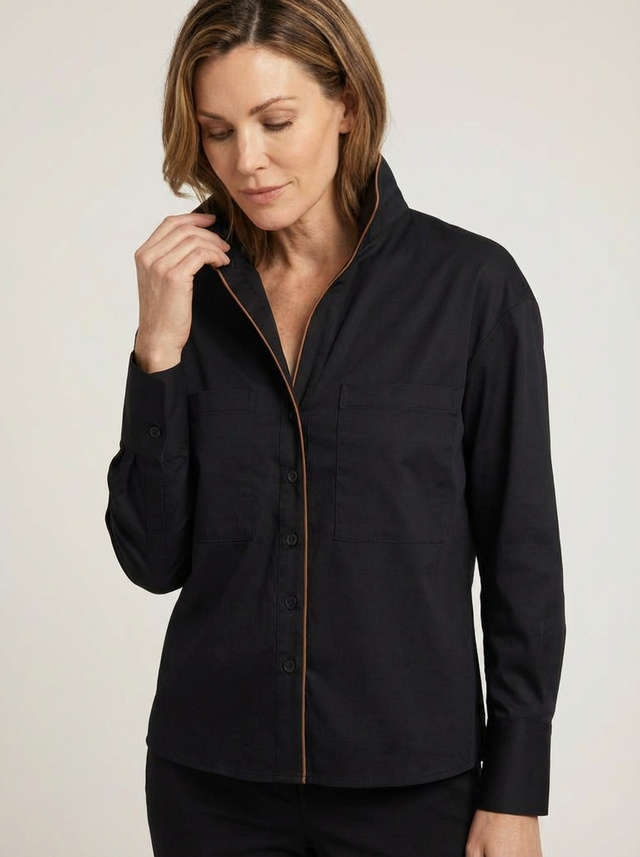 Designed in a crisp black cotton with Tobacco piping, The Piper features two front patch pockets and long sleeves that roll up effortlessly for versatile styling. Chic, polished, and endlessly wearable, she’s the shirt you’ll be reaching for all season long.