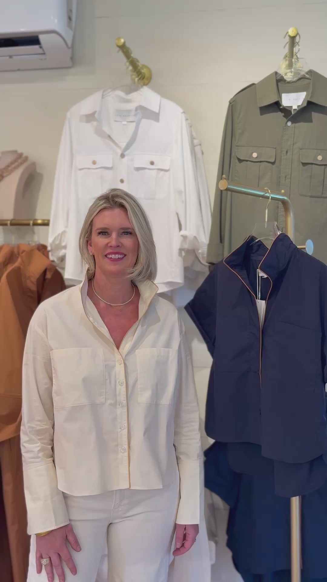 Designed in a crisp white cotton with white piping, The Piper features two front patch pockets and long sleeves that roll up effortlessly for versatile styling. Chic, polished, and endlessly wearable, she’s the shirt you’ll be reaching for all season long.