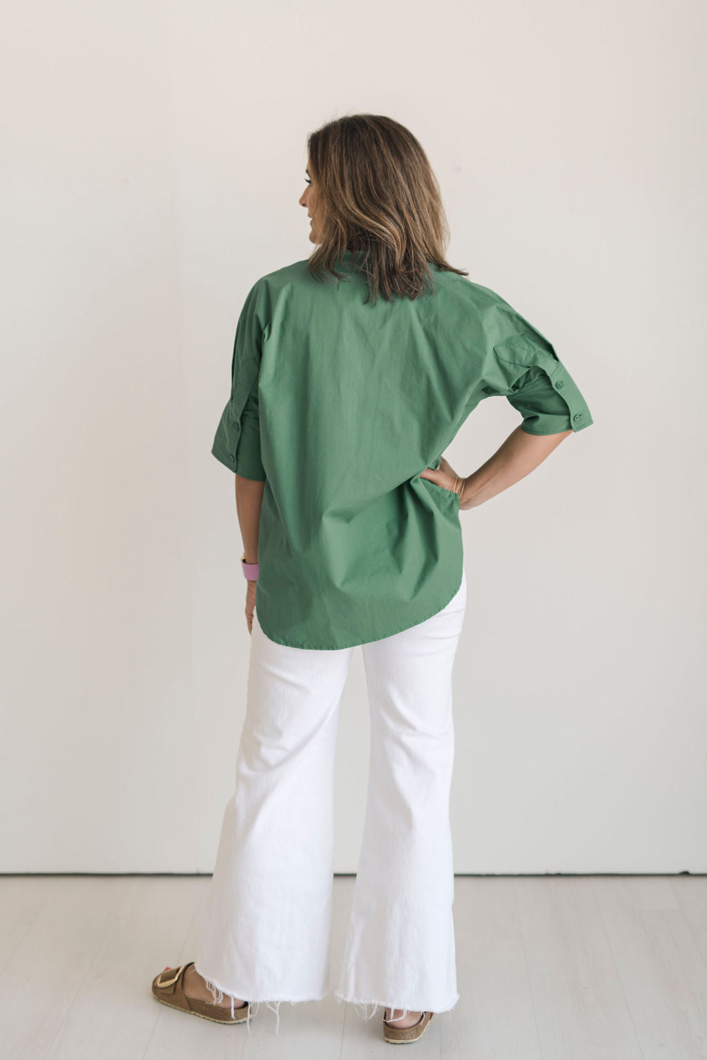 Our chic and effortlessly stylish Pullover Cotton Shirt. Inspired by a laid-back yet refined vibe, this shirt is designed to seamlessly complement your favorite denim jeans with its high low style perfect for a front tuck. Crafted with meticulous attention to detail, this pullover style features a modern twist with a short stand-up collar, exuding an air of sophistication while maintaining a casual flair. The longer short sleeves with buttons offer versatility, allowing you to wear them as is, open, or elegantly cuffed, depending on your mood and occasion.