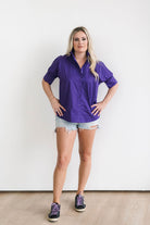 Chic, timeless, and oh-so-versatile—our Purple Short Sleeve Ruffle Collar Shirt is a wardrobe must-have! Featuring a playful ruffle neckline and a flattering fit, this best-seller pairs perfectly with everything from jeans to skirts. Designed for effortless style and all-day comfort, it’s the piece you’ll reach for on repeat.
