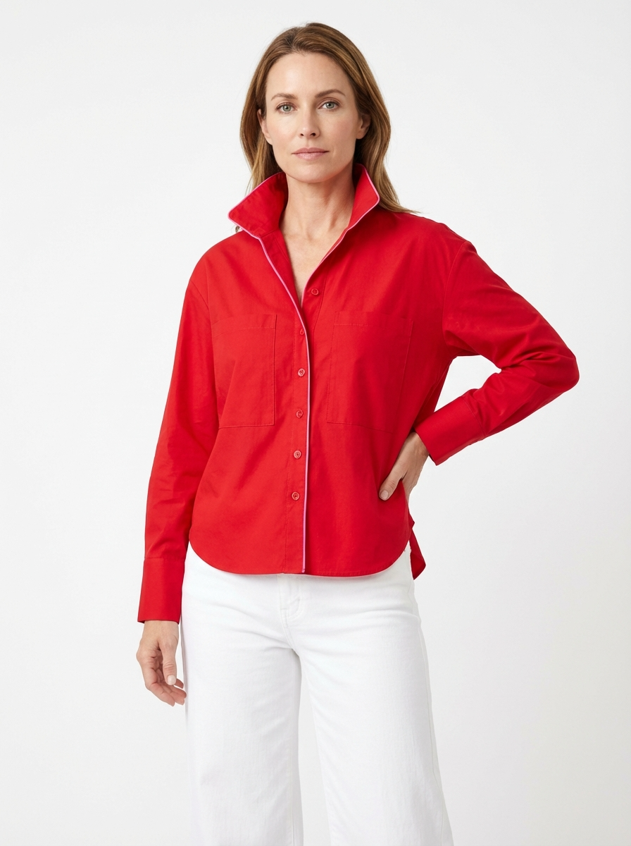Designed in a crisp red cotton with pink piping, The Piper features two front patch pockets and long sleeves that roll up effortlessly for versatile styling. Chic, polished, and endlessly wearable, she’s the shirt you’ll be reaching for all season long.